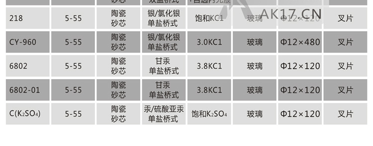 C(K2SO4)參比電極:常用的一種參比電極,其參比溶液中不含氯離子,適合非氯離子場合使用。